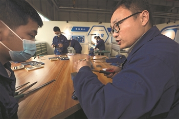 4月23日,山东淄博,在山东新华医疗器械股份有限公司感控事业部夏京亮创新工作室内,夏京亮(右一)正在给学员讲解技术要领,为即将到来的技术等级认定考试做准备。