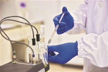 在一台色谱仪前,邓福亮向记者演示起来。只见他的一双“蓝手”动作敏捷,用一根针管抽取少量待检样品后,右手迅速将其注入仪器,左手同时按下设备启动按钮。