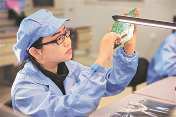 图④ 王鹤在检验焊接完成的电子元件。受访者供图