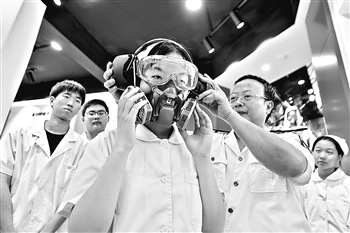 浙江省湖州市长兴县卫生监督所,工作人员指导学生体验穿戴职业卫生防护用品。