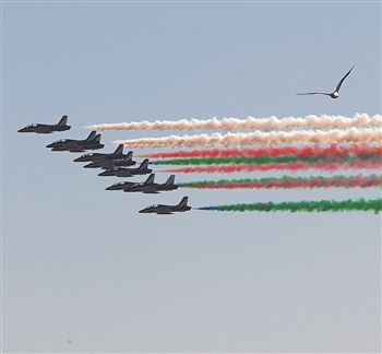4月25日,意大利“三色箭”飞行表演队在罗马举行的纪念仪式上喷出代表意大利国旗颜色的红白绿三色烟雾。