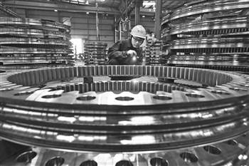 4月24日,安徽马鞍山经开区统力回转支承有限公司技术人员在检验新开发的回转支承质量。
