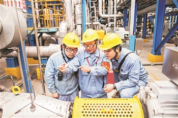 扬子芳烃加氢裂化技能大师、全国劳模刘建华曾在中国石化技能大赛中拔得头筹,他利用劳模工作室团队优势大力开展导师带徒,他的徒弟咸小丹也在扬子石化职业技能竞赛中一举夺魁。图为刘建华(中)为班组员工现场传授设备保养知识。 玉晨雪 文 李树鹏 摄