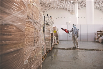 4月27日,工作人员在海南国际会展中心对运抵的消博会参展货物进行消杀防疫。