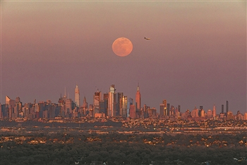 4月26日,“超级月亮”从美国纽约曼哈顿的天际线上升起。 新华社记者 王迎 摄