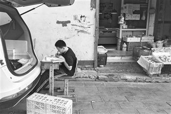 菜摊边的临时书桌