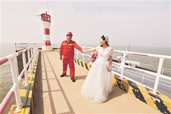 4月22日是他俩结婚12周年的纪念日。他们在人工岛上重拍婚纱照,作为特别的纪念。齐津津穿婚纱,王明珠是一身红工服。“红配白,很搭。这是我的主意。”王明珠腼腆地说。