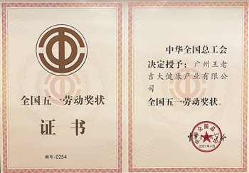 王老吉大健康荣获2021年全国五一劳动奖状。