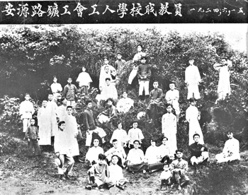 安源路矿工会工人学校教职员合影。第一排右起第一人为陈谭秋同志。第三排右起第二人为刘少奇同志。