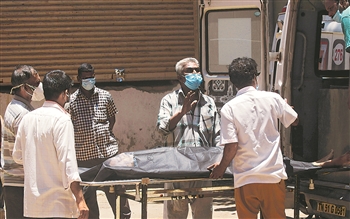 5月8日,在印度金奈的一所医院,亲属转移新冠病逝者的遗体。