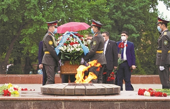 5月9日,在乌兹别克斯坦首都塔什干,士兵参加敬献花圈仪式。自1945年起,苏联将5月9日定为“卫国战争胜利日”,并举办各类纪念活动。 新华社发(扎法尔 摄)