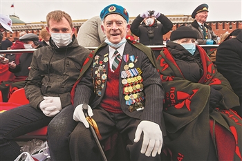 5月9日,在俄罗斯莫斯科,二战老兵观看胜利日阅兵式。俄罗斯9日在莫斯科红场举行盛大阅兵式,纪念卫国战争胜利76周年。 新华社发(叶甫盖尼·西尼岑 摄)
