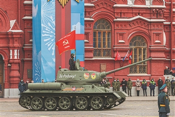 5月9日,莫斯科胜利日阅兵式上,T-34型坦克驶过红场。新华社发(叶甫盖尼·西尼岑摄)
