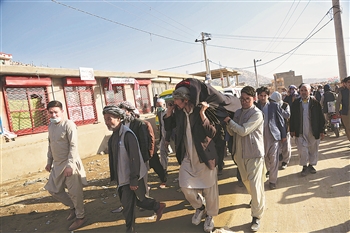 5月9日,在阿富汗喀布尔,亲属搬运爆炸遇难者的遗体。