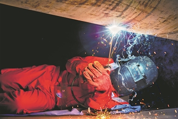 弧光四溢,焊花飞舞,伴着“刺刺”声响,在国家管网东部储运沧州处抢维修队岗位练兵活动现场,焊工们正在练习焊接技术。他们日复一日勤学苦练,树立起战无不胜、攻无不克的管道抢维铁军形象。图为一名焊工在躺焊。 闫紫坤 摄