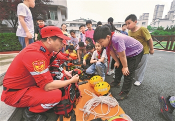 5月11日,浙江民安救援中心湖州支队队员向小学生介绍救援装备及救援器材。