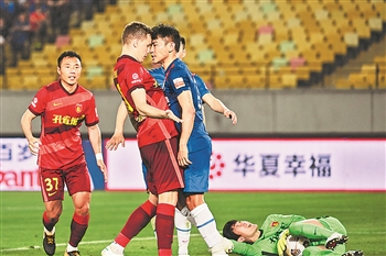 5月10日,河北队球员梅米舍维奇(左二)与上海申花队球员于汉超在比赛中发生冲突。当日,在2021赛季中国足球协会超级联赛(苏州赛区)第四轮比赛中,河北队以1比1战平上海申花队。 新华社记者 朱峥 摄