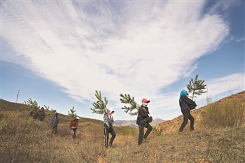 上图:5月12日,在河北省围场县围场镇湖字村湖泗汰沟林业建设工程区,造林队员在运送樟子松树苗。