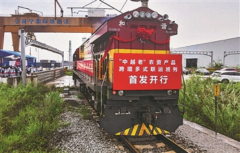 5月13日,“中越老”农资产品跨境多式联运班列驶离南宁国际铁路港。当日,广西开行首趟“中越老”农资产品跨境多式联运班列。 新华社记者 张爱林 摄