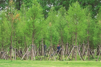5月13日,园林工人在黄海国家森林公园里护理树木。