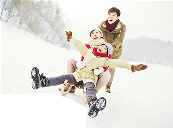 图①:一家三口正在雪地里快乐地玩雪橇。视觉中国供图