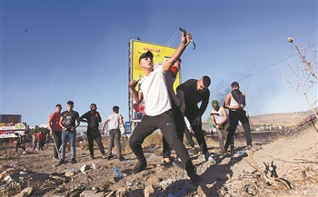 5月15日,巴勒斯坦人在约旦河西岸城市纳布卢斯附近向以色列士兵投掷石块。