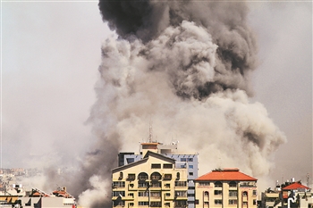 5月15日,加沙地带一栋多家媒体所在大楼被以军空袭后冒出浓烟。