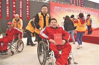 5月16日,在西安临潼区新丰镇光辉实业有限责任公司临潼汽车拆解厂,陕西省、西安市残疾人联合会举行“全国助残日”暨集中安排残疾人就业入职仪式,现场为首批经过职业技能培训的50名残疾人颁发聘书。