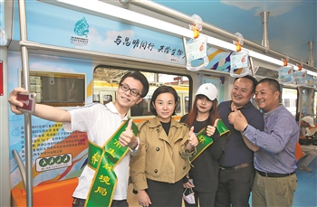 5月17日,环保志愿者在“生态文明号”地铁专列上和乘客合影。