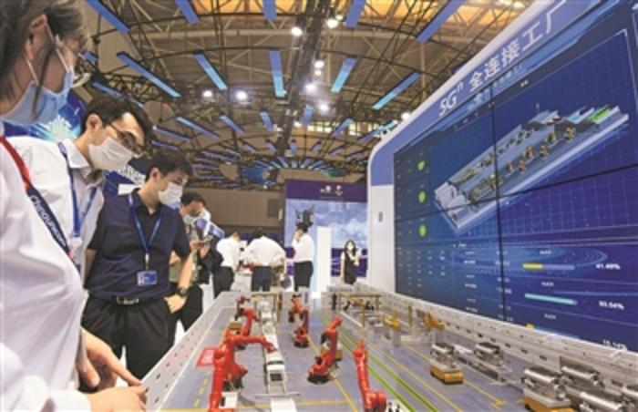 图为参观者在天津梅江会展中心观看“全连接工厂”演示模型。新华社记者 赵子硕 摄