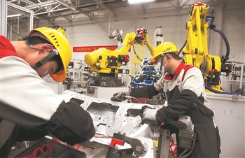 5月20日,浙江省嘉兴市长城汽车生产车间内,工人们正通过智能设备进行汽车零部件的生产和组装。