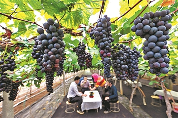 初夏时节,青岛市即墨区移风店镇上泊村的暖棚葡萄进入成熟期,果农们忙着采摘,供应市场。近年来,即墨区移风店镇引导农民采取“合作社+农户”的模式,因地制宜发展有采暖设施的葡萄暖棚,打造农旅融合田园观光综合体,带动农民增收,助力乡村振兴。