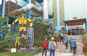 5月23日,游客走过南钢特钢事业部中棒厂车间门口的“钢铁战士”雕塑。