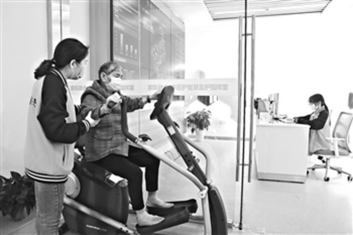 5月19日,浙江嘉兴市一所智慧照料中心内,一位老人在进行身体康复训练。近年来,长三角地区打造多个养老共建共享平台,通过“软件信息系统+智能硬件设备”的方式,对老年人的健康及安全进行全面监测,实现家院融合、智慧照料。 本报记者 王伟伟 摄