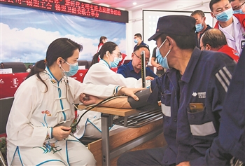 5月26日,内蒙古锡林郭勒盟蒙医医院的医务人员为矿区职工量血压。当日,由锡林郭勒盟工会、锡林郭勒盟卫健委联合组织的“医药服务行——我为群众办实事”系列活动,走进锡林郭勒盟蒙东矿业有限责任公司,为长期坚守在工作一线的矿区职工送上健康服务。 新华社记者 彭源 摄