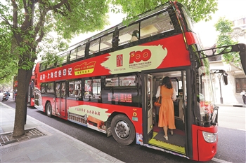 5月25日,上海,乘客乘坐红色专线车。当日起,“中国共产党一大·二大·四大纪念馆红色专线车”开始试运行,市民游客可乘坐红色双层观光巴士,打卡上海市主要红色地标。专线全程20公里,车程大约90分钟,设立五卅运动纪念碑站、中共一大纪念馆站、二大会址纪念馆站、四大纪念馆站以及南京东路站五个站点。 人民视觉 供图