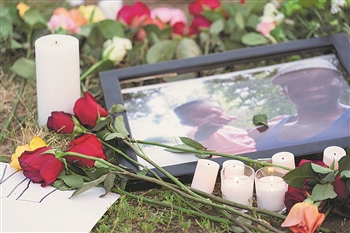 当日,在美国华盛顿白宫附近举行的悼念弗洛伊德的集会上,人们将鲜花和蜡烛摆放在弗洛伊德和家人的照片旁。 新华社记者 刘杰 摄