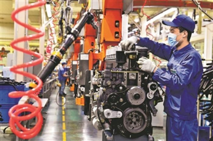 图为4月22日,在位于山东潍坊的潍柴集团总装车间,工人在流水线上装配发动机。