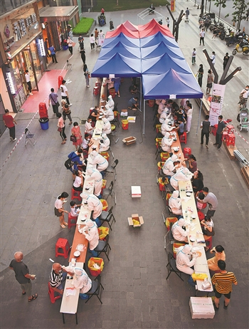 5月27日,在广州荔湾区广钢新城核酸临时采集点,南方医科大学南方医院的医务人员进行核酸检测采样。
