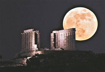 5月26日,“超级月亮”出现在希腊苏尼翁的海神庙遗址上空。26日晚,年度最大满月“叠加”年度唯一月全食所形成的“超级月全食”如约现身天宇,为公众带来了难得一见的视觉盛宴。 新华社发(马里奥斯·罗洛斯 摄)