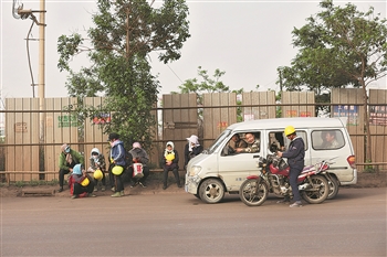 5月23日,在乐亭县京唐港的一处马路边,来自相邻的昌黎县的女工们正等待包车回家。