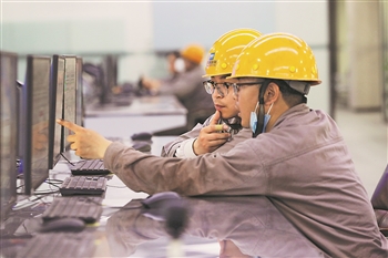 5月21日,河钢唐钢新区主控室内,两名操作工正在探讨业务。