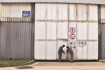 5月19日,河钢唐钢本部一钢轧厂的留守职工何志军(图左)和工友巡视老厂区。钢厂搬迁后,由于家庭和自身原因,今年55岁的他选择留下来,在钢厂停产后成立的护厂作业区工作。