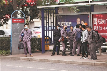 5月24日,乐亭县海港开发区内等待乘坐班车回老厂区的钢厂职工。