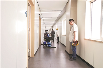 5月21日,在河钢唐钢新区的一处办公楼内,保洁人员开着拖地车打扫楼道。