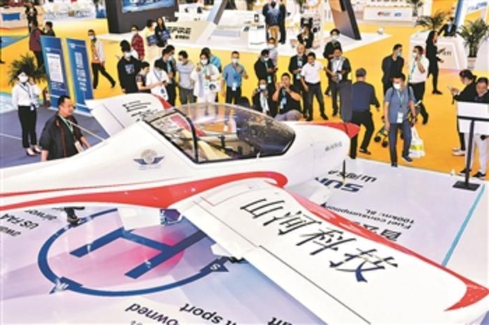 图②:2021长沙国际工程机械展上,山河智能展出的阿若拉轻型运动飞机吸引观众围观。