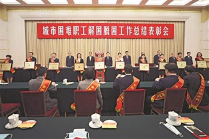 全总党组书记、副主席、书记处第一书记陈刚主持会议。全总副主席、书记处书记魏地春宣读关于表扬在城市困难职工解困脱困工作中作出重要贡献的集体和个人的通报,关于授予在城市困难职工解困脱困工作中作出突出贡献的集体和个人全国五一劳动奖状、奖章的决定。120个集体和120名个人受到通报表扬;云南省总工会职工帮扶中心等20个集体和郭燕等31名个人分别被授予全国五一劳动奖状、奖章。