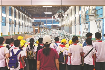 图为孩子们在世界最大规模的再生铅处理基地废铅酸蓄电池料仓前专注听讲解。刘再平 摄 李艳 文