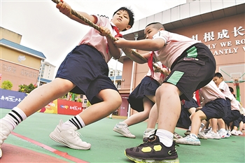 5月31日,广西南宁市玉兰路小学的孩子们在进行拔河比赛。当日,2021年“奔跑吧·少年”儿童青少年主题健身活动广西分会场启动仪式在南宁市玉兰路小学举行。国家体育总局启动“奔跑吧·少年”儿童青少年主题健身活动,力争促进儿童青少年增强体质、健全人格、锻炼意志、全面发展。新华社记者 周华 摄
