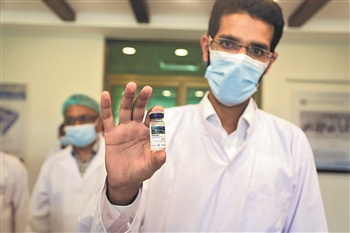 6月1日,在巴基斯坦伊斯兰堡,工作人员展示本地灌装生产的中国康希诺新冠疫苗。